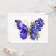 Smycken, blå, safir, gnistrande fjäril med vingar dekorerade med blå, värdefulla blommor med gyllene blad på vit bakgrund.