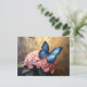En livfull blå fjäril vilar på ömtåliga rosa blommor, mot en gyllene texturerad bakgrund.
