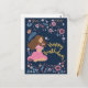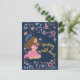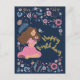 Blått födelsedags kort med en dam omgiven av blommor.
