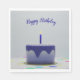 En blåfärgad tecknad-tårta med sprinkeltäckt frost som springer ner från sidorna och ett tänt ljus sitter på en gyllene platta på en räknare som är täckt av färgade prickar.