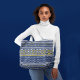 Blått, enkelt geometriskt objekt, vilket gör att texten blir ännu attraktivare. Prova med den här väskan och din feedback.