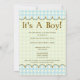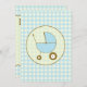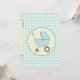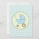 En inbjudan med en blå gingham bakgrund över varmt beige med brun kant. Personifiera den bruna typsnittstexten med detaljer om din händelse. Den motsatta sidan är solid gingham med en blå barnvagn inuti en matchande cirkelformad ram.