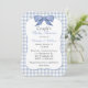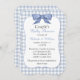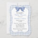 Snyggt pars parentes handformade inbjudan till babydusch utförd i en ljusskifferblå och vit gingham kontrollerad mönster. Bilder av ett blått, konturerat vitt textområde i mitten har en söt skiktblått båge överst. Baksidan görs i samma gingham mönster. Anpassa all text till kostym som din aktivitet behöver.