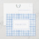 En klassisk blå gingham-vattenfärg med en lagerkrans för initial monogram tack-kort