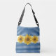 Det här är en fantastisk väska för varje dag, för att handla och för att resa. Korsningen stil är perfekt eftersom väskan stannar, inte faller av din axel och händer är fritt. Den här väskan är 100 % styv borstad polyester som ge är en kanvas. Utformningen har en marin och vit utskrift över Gingham. Sedan lades ett vitt rand till med tre vattenfärger som illustrerade solblommor. En klassisk sommarpåse i stil för dina sommarbehov.