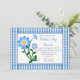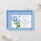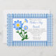 Denna inbjudan till Mors Dag har en vacker blå och vit gingham-design med en blå blomma i mitten. Anpassa denna inbjudan med din egen text.