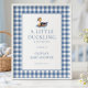Blå Ginghamstuvanka Välkommen till Baby Shower. Finns digitalt och tryckt. En modern design med en söt illustration av en stuvandunge och blå gingham bakgrund. Anpassa enkelt orden till dina egna.