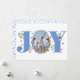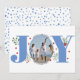 Blå glädje med bär jul fotobutik. Den visar ordet "GLÄDJE" med röda bär och grönska medan istället för bokstaven "Ä" finns ditt foto. Baksidan har blå prickar.