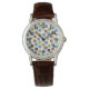 Den här kvinnoklockan har en geometrisk design av blå, grönt och bruna punkter.
