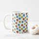 Mugg har en geometrisk utformning av blå, grönt och bruna punkter.