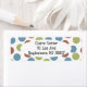 Dessa returetiketter har en geometrisk utformning av blå, grönt och bruna punkter.