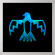 Svart poster med en stiliserad tonfågel med blå grönt.
