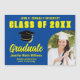 Denna moderna blå och gula anpassade senior-examens inbjudan magnetkort med examensfoto under modern båge. Den har klassisk typografi av ditt universitetsnamn för klassen 2026 och variabla bokstäver. Anpassa med ditt examenår under den chic handskrivna skriften och svarta examenshatten för bra vykort. Lägg till dina festdetaljer på baksidan.