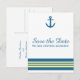 Elegant och klassiskt Marin Ankare Spara Datum Postkort med ett enkelt båtanker och en mängd ränder i mörk marinblå och gul. Detta nautiska strandtema spara datum kan enkelt anpassas med din bröllopsinformation. För fler anpassningsalternativ, klicka på knappen Anpassa.