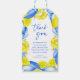 Lägg till en glad och elegant touch på dina bröllopsfestgåvor med dessa blå och gula lemon-tema tack-gavor. Med akvarellcitroner, grönska och medelhavsinspirerade kakelaccenter är dessa etiketter perfekta för att knytas på presentpåsar, ljus eller små gåvor. Idealiskt för toskanska trädgårdsfester, citrus-tema shower och sommarbröllopsfiranden. Personalisera med brudens namn eller ett sött meddelande för en stilren finish.