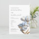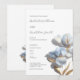 Denna eleganta konstnärliga minimalistiska bröllopsinbjudan har moderna vita tredimensionella blå och gyllene blommor.