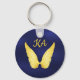 Ett par faux guld färgad ängel vingar på en ojämn blå bakgrund färg. Mall för ditt monogram, Orange färgad brev.