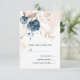 Elegant bröllopsbekräftelse vykort med illustration av akvarell i marinblå och guld med bleka nyanseringar i persika.
