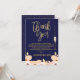 Denna bröllopsfestkort "tack" har text i faux-guld kalligrafi samt ett högt elegant champagneglas på en marinblå bakgrund. Designen inkluderar också ett delvis akvarell blomsterarrangemang vid basen av designen. Baksidan av inbjudan är också marinblå med ett slumpmässigt faux-guld prickmönster. Samma design bröllopsfest inbjudan finns tillgänglig i butiken. Detta bröllopsfest "tack"-kort är redo att anpassas.