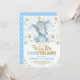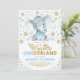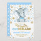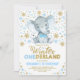 Räknat vintermatade första födelsedagsinbjudan med en aptitretande elefant från baby, blå och guld, snöflingor, stjärnor från Faux glitter och konetti sprinkles