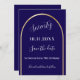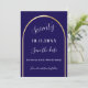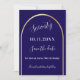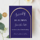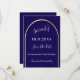 A Spara datumkortet för en 70:e (eller någon annan ålder) födelsedagsfest. En mörk blått bakgrund, dekorerad med en faux guld-båge. Anpassa och lägg till ett datum och ditt namn. Texten: Sjuttio och Spara datumet skrivs med ett stort trendig-handskript med stil.
