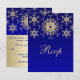 Det här moderna och festliga marinblå och kungliga blå med guldglittrande LOOK (tryckta) snöflingor svarskort matchar den bröllopsinbjudan som visas nedan. Den visas här på vanligt papper. Det är lätt att anpassa med din egen information. ***VAR VÄNLIG var försiktig om du ändrar papperssort. Det metalliska guldpappret är mycket mörkt och ger inte trevliga resultat. All text kan anpassas och det kan även pappersvalet. Om det finns några andra föremål du behöver för att göra din händelse extra speciell, till exempel numrerade bordskort, presentkort eller etiketter, porto, kuvert eller platskort osv., vänligen maila din förfrågan till niteowlstudio@gmail.com.