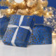 Elegant party-gåva som omsluter papper - marin blå bakgrund, små gyllene cirklar.