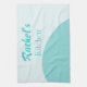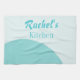 Perfekt för spill, kan den här blåa snurrhandduken anpassas till din glädje. Den här kökshandduken har en blå halvcirkelbakgrund som har ett akvaka färg i grund lämnat hörn, med resten av utformningen ljusblå. Ditt namn är skrivet överst i kursiv blå skrift med "Köks" skriven i blått manuskript. Anpassa din idag! Originalteckning: © 2016, Rhonda Jones