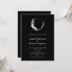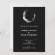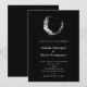 En bröllopsinbjudan med en mystisk illustration. En mörkblå halvmåne med en elegant tunn cirkelkontur och vita blomknoppar längs dess kanter.