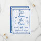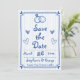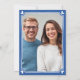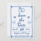 Blått hand plockade-kort med vismisk återtro-Fransk Parisian stil bröllop spara datum-platta fotkort. Den visar små handdragna manusar i Fransk Parisian stil i blått vid mönster i blek blå och vit rand. Det innehåller charmerande munstycken av hjärtan och bröllop ringar, kompletterat med ett typsnitt med handskrivet utseende och ett gräns med hjärtan i hörnen som förstärker dess snabba dragningskraft. Utformningen av presenter är en lekfull och färsk estetik och är anpassade att återspegla ditt personliga stil. Baksidan innehåller ett vackert foto av paret.