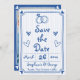 Blå hand plockade-manusdocka med vismisk bild spara datumet