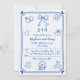 Blåblått, vismisk retro Fransk stil bröllopsinbjudan. Den här bröllopsinbjudan är en charmerande blandning av stollig och Fransk, med en snygg, handritad blå doodlar som anger en lekfull ton. Gästerna kommer att fängslas av de dunkla illustrationerna, som omfattar söta hjärtan, ett vackert ring och en söt buske, som alla är vackert arrangerade mot en mjuk blå och vit strippad bakgrund. Det handskrivna stil-teckensnittet ger en personlig beröring, medan det hjärtskärda ram i hörnen förstärker den övergripande charmen och på ett perfekt sätt fångar din stora dags glädje och entusiasm.