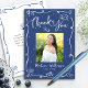 Se till så att din favoritstudent visar uppskattning till alla som stödde deras milstolpshändelse! Skicka ut detta tokiga, lekfulla, enkla, moderna, personliga fototackkort. På framsidan överlagrar en rolig vit handskriven typsnittsstil och handritade examensikoner skissade doodlar, tillsammans med ditt anpassade foto, en marinblå bakgrund. Lägg till fotot du väljer och anpassa den anpassade texten med din students namn och examensår. På baksidan skriver du in ditt anpassade meddelande eller tar bort texten helt så att du kan skriva din egen handskrivna anteckning. Matchande inbjudningar, adressetiketter, banderoller, klistermärken och andra examenspresenter finns också tillgängliga i denna trendiga och stilfulla kollektion. Garanterat att tillföra en stilfull touch till deras korrespondens!