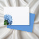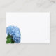 Blå hortensia blomma dekorerad plats eller följekort för ett bröllopsfirande. Ljusblå, realistisk blomma från designlinjen “Blue Heaven” har några gröna blad fästa vid stjälken. Blomman är tryckt i det nedre vänstra hörnet. Baksidan är enfärgat blå. Använd för att handskriva namn på gäster som ska sitta vid bord och inkludera bordnumret om de används som följekort.