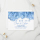Blomsterliga save the date-kort med ljusblå hydrangea-blommor kant vid toppen. Anpassa blå text, på horisontellt papper - visas på en pappersuppgradering - med brudens och brudgummens förnamn, två eller tre rader för platsen (inkludera en bröllopswebbplats om det behövs), och datum, och en rad för att tala om för gästerna att en formell inbjudan kommer att följa. Baksidan är vit. Denna design erbjuds också som en omedelbar nedladdning.