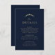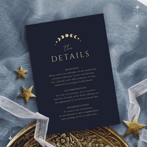 Det "Blå himmelska bröllopsföljekortet" är ett himmelskt viskande mot en djupblå bakgrund, som sömlöst kompletterar din bröllopsinbjudan. Halvmånen, stjärnorna och månfaserna skapar en harmonisk komposition, medan det stilrent enkla anpassningsbara initialerna för paret lägger till en personlig touch och ger flera lager av symbolik till de detaljer du vill dela.