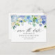 Spara datumet! Meddela din vigsel dag till familj och vänner med detta blomsterrika spara datumet vykort. Det har en akvarell blomsterkrans av blå och lila hortensior, elfenbensrosor och gröna accenter. Personifiera genom att lägga till namn, datum, lokal och andra detaljer. Dessa hortensia spara datumet vykort är perfekta för höstbröllop.