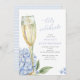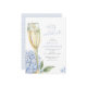 Denna vackra design har blåa hortensia-blommor, ett champagneglas i guld och din egen text. Använd mallformuläret för att lägga till din information.