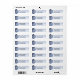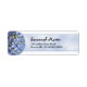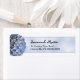 Blå vattenfria adressetiketter. Små, rektangulära klibbiga etiketter med lätt blåa blommor och blå bakgrund intill vitt. Malltexten är svart i sött teckensnitt för namn och utskriven text för adress.