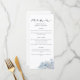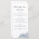 En elegant bröllop- eller möhippa-meny med dammiga blåa vattenfärgsblommor i vit bakgrund och "meny" i modern kalligrafibaserad personlig med din händelseinformation.