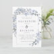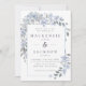 En inbjudan från söt och elegant bröllop som innehåller ram av kaskadblåa hydrangeer och löv på vit bakgrund. Centrumet har en ljusblå, vit rektangel med kanter, med detaljer om bröllop i skifferblått och träkol serif-teckensnitt. Baksidan är i fast ljus/dammblått. Den här designen är underbar för ett vinterbröllop.