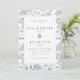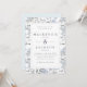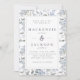 En inbjudan till söt och elegant bröllop med en vattenfärgsbakgrund med blommönster av blåa vattenområden och löv på vit bakgrund, täckt med en dubbla rektangel ram. Bröllop-detaljer finns i kapitlet "Sate blue charcol serif". Baksidan är i fast ljusblå färg.