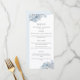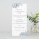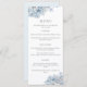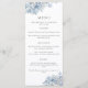 En elegant bröllop-meny med dammiga blå vattenfärgsblommor, personlig med namn och bröllop. Menyinformationen finns i grått.