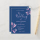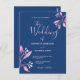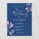 En enkel bröllopsinbjudan till trendiget i blå rosa. En blå bakgrund dekorerad med botaniskt rosa färgad grenar och löv. Modern stor, hanterad text, typografi med texten: Bröllop. Mallar för namn och bröllop. Rosa färgad text.