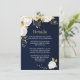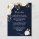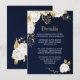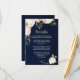 Romantiska vita blommor och guld löv: Blått detaljförslutningskort för marinen. Uppgifterna om glitter simuleras