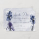 Den här designen har mörk blått vattenfärgshöjningar på en mörk blått vattenfärgsbakgrund som tvättar bakgrund. Baksidan är också en mörk blått vattenfärgstvätta. Detta kort är en del av Blue Iris Flowers Blue Modern Bröllop Suite av kort som skapats av enbart Farmhouse Press.
