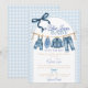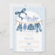 Snyggt, avslappnat och fullt av charm, denna baby shower-inbjudan i blå jeans presenterar en söt tvättlina med små pojkkläder, skor och accessoarer i denim mot en klassisk blå rutig bakgrund. Perfekt för ett "Blue Jean Baby Is On The Way"-tema, denim-baby shower eller pojkkläders tvättlinje-baby shower, denna inbjudan ger en avslappnad, otroligt cool stämning till alla babyfiranden.