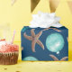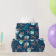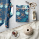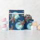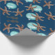 Tropisk julklapp som är papper med stjärnfisk, havshästar och akvblåa boll-prydnadsföremål som är tryckta över mörk marinblått färg.