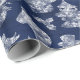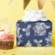 Backa dina presenter i den här söta chicens lantgård, papper julomslutning, med en mönster av skumt, vit inslag med en mörk blått, rustisk träbakgrund.