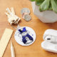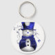 En vit, söt snögubbe, klädd i en blå samvet top hat och väst, omgiven av blå stjärnor till jul.